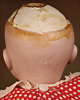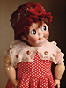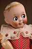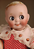 charmantes Googly von Kestner, um 1910, Modell JDK 221, schelmisch drein blickender Biskuit-Porzellan-Kopf, rundliches modellierte Gesicht mit pausbäckiger Ausformung verleiht der Puppe eine besonders kindliche und heitere Ausstrahlung, große braune seitlich blickende Glas-Schlafaugen, gemalte Wimpern sowie schräg verlaufende, zart schattierte Brauen, Stupsnase, geschlossener Mund in typischer „Wassermelonenscheiben“-Form mit angedeutetem Lächeln, Toddler Kompositionskörper mit Kugelgelenken, Polkadot-Kleid, braune Mohair-Perücke, 33 cm Markierung: „B. made in Germany 6 JDK 221 Ges. Gesch.“ Zustand: Insgesamt ausgezeichnet, Provenienz: " Sammlung Gerda Ott "