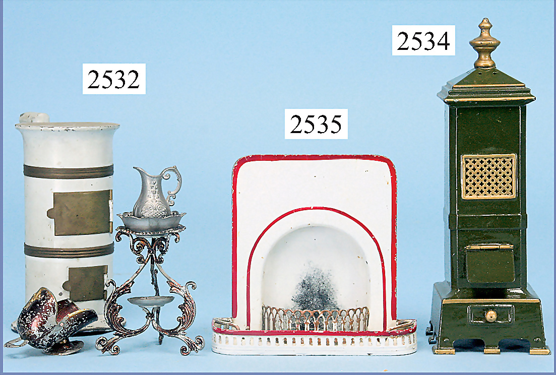Konv. Puppenküchenteile, Ofen, Blech lackiert, 13 cm, Messingtüren, dazu Waschlavoir, mit Krug, Zinn, 8 cm, 1 Kohlenschütte Zinn, Lackfehler