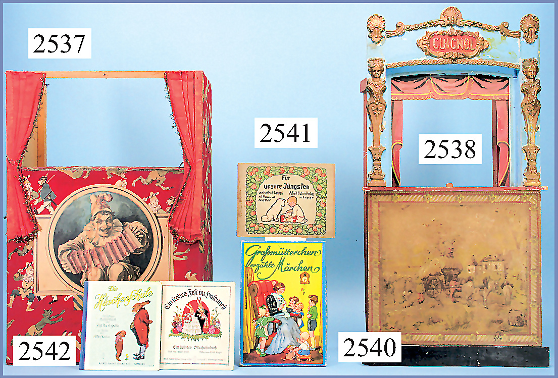 Kasperletheater, um 1900, engl., 46 cm x 71 cm, Holz/Pappe, Stoff bezogen, lithogr. Clownbild, sowie Kasperlespiel-Darstellung