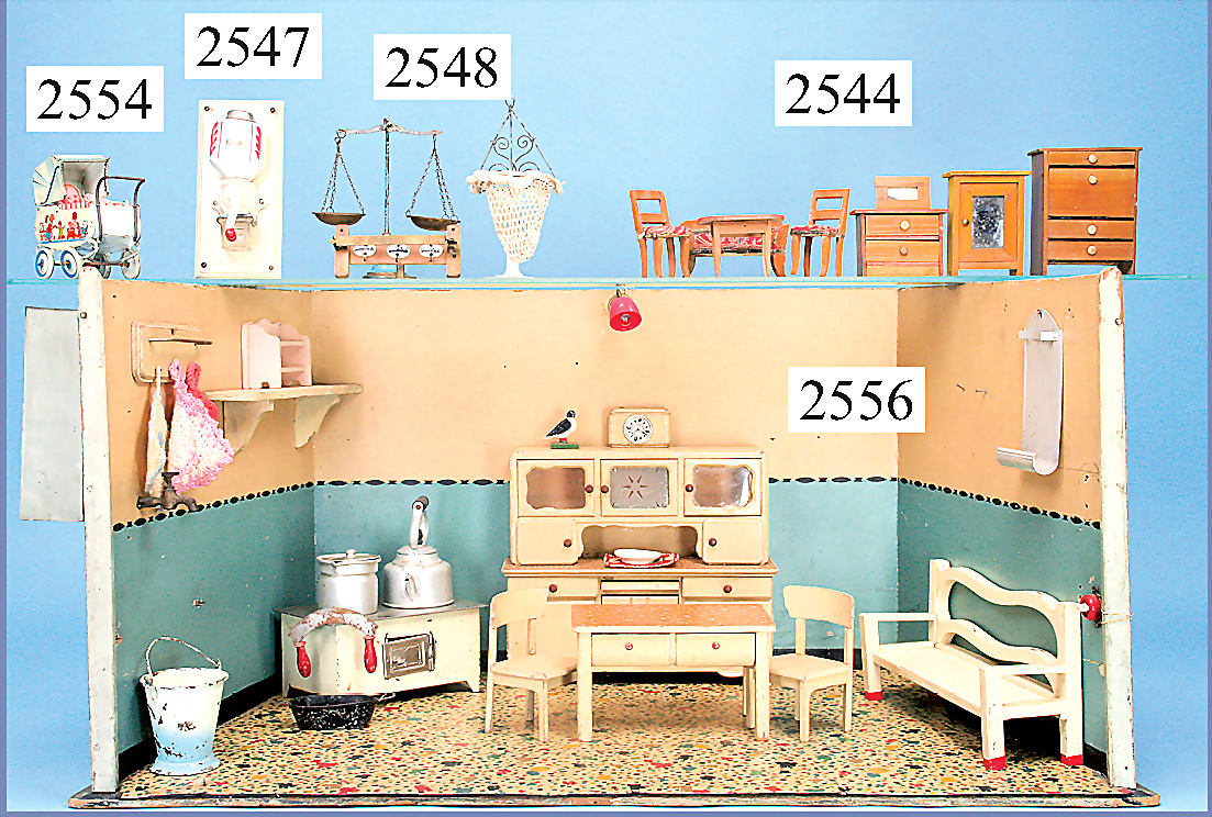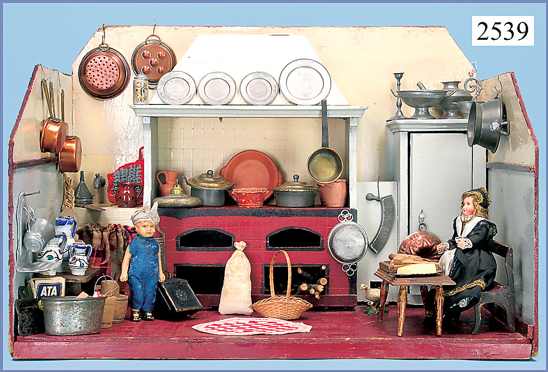 Puppenstuben-Küche, um 1900, 98 cm breit, 43 cm hoch, 48 cm tief, fest eingebaute Regale, alte Bemalung an Wand u. Boden, Bemalung der Möbel etwas später, mit Herd, reichhaltig Zubehör, Keramik-, Porzellan-, Blechteile
