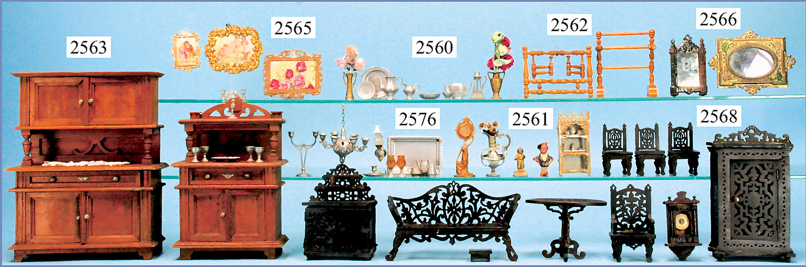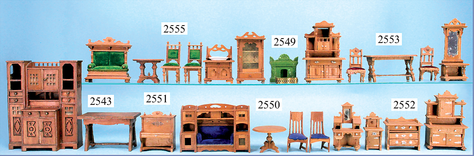 Puppenstuben-Möbelprogramm, Laubsägearbeit, Schrank, Höhe 17 cm, Bank, 6 Stühle, Tisch, Kommode, Sessel, Uhr, Fußschemel, für kl. Stube o. Puppenhaus, um1900