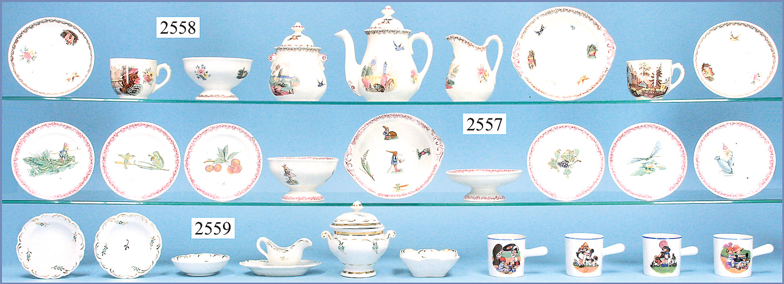 Konv. Porzellanteile, Speiseservice, Suppenschüssel, Sauciere, 3 Schalen, 5 Teller, Durchm. 9 cm, Golddekor, dazu 4 Tassen mit Kindermotiv
