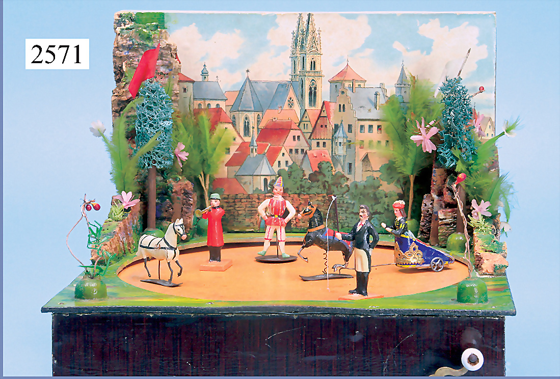 ERZGEBIRGE, Zirkusaufführung, Pferde-Dressur, sowie Dame mit Streitwagen, Kurbelantrieb, mit im Boden sich drehender Magnetplatte, wie von Geisterhand bewegen sich auf 1 Teller mit Landschaft die Figuren, Holz/Teig, mit Blechfuß, 4 cm hoch, außergew. Darstellung, mit Orig.-Holzkiste, museal