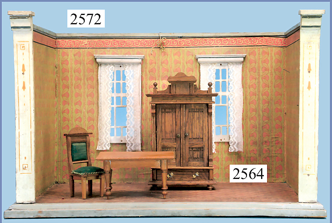 GOTTSCHALK, Puppenstuben-Gehäuse, 32,5 cm hoch, 29,5 cm tief, 48,5 cm breit, Orig.-Tapete an Wand u. Boden, Orig.-Bemalung der Frontleisten, sowie außen 2 Fenster