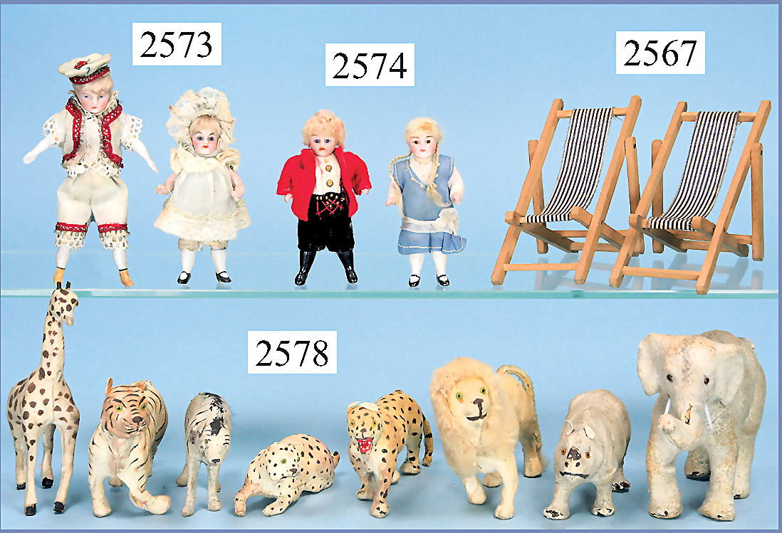 2 Teile Puppenstuben-Puppen, Mädchen, Ganzbiskuit, 9 cm, fester Kopf, fest eingesetzte Glasaugen, geschl. Mund, bewegl. Arme u. Beine, Orig.-Kleidung, 1 Junge, Biskuitbrustblattkopf, -arme u. -beine, anmodellierte Schuhe u. Strümpfe, Stoffkörper, 12 cm, alte Kleidung