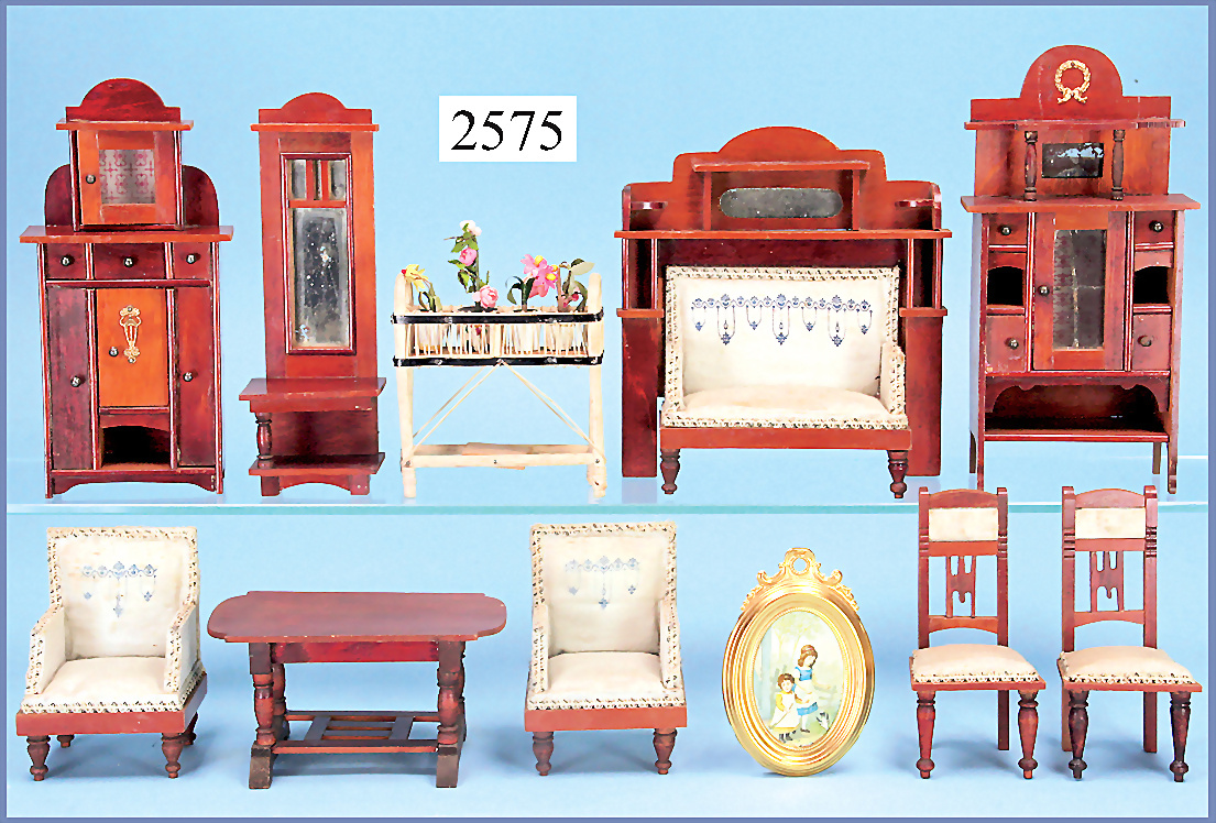 Puppenstuben-Birnbaum-Möbelprogramm, Jugendstil, Sitzgruppe, umbautes Sofa, 16 cm hoch, 2 Stühle, 2 Sessel, Tisch, Spiegel, 17,5 cm, 1 Säule fehlt, 2 Schränke, 1 Blumenbank, 1 Bild, Rahmen Messingblech vergoldet, Seidenbezug in gutem Zust., schöner Orig.-Zust.