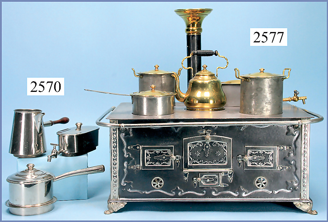 MÄRKLIN, Puppenherd, 41 cm breit, 31 cm tief, 41 cm hoch, Türen u. Löwentatzenfüße vernickelt, Wasserschiff, 2 Töpfe, Deckelpfanne u. Kaffeekocher, mit Brenner, beeindruckende Gr., sehr guter Zust.