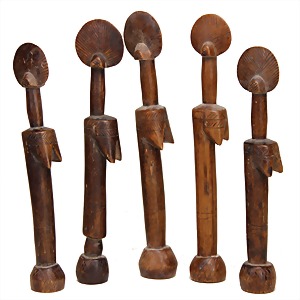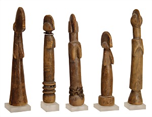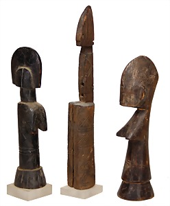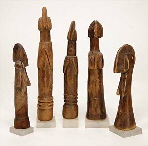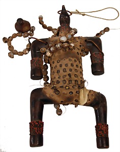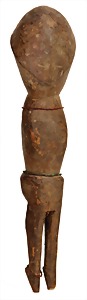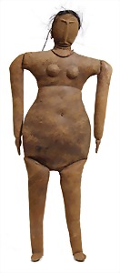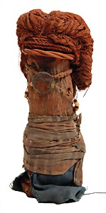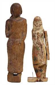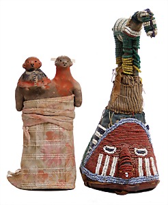 2 Teile, 1 Tonfigur, mit Stoff umwickelt, 1 kl. Hut, mit Perlen bestickt, mit Stoff, Leder u. Holz, 16 – 22 cm