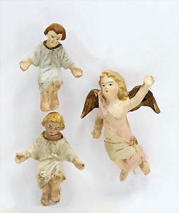 Christbaumschmuck, Watte, Mädchen, Mohair-Frisur, Kreppkleidung, altersbed. etwas abgegriffen, Masse-Gesicht, 12,5 cm