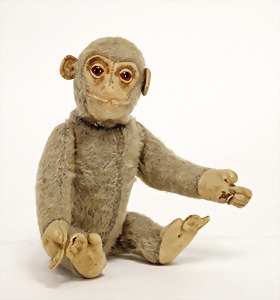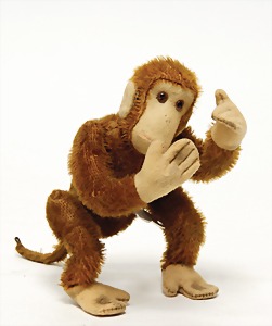 springender Affe, ca. 1908, Uhrwerk intakt, 16 cm, Mohair, Filzgesicht, -arme u. –beine, mit Bing-Plakette, teilw. Mohairverlust, ausgefallen, mit orig.- Schlüssel