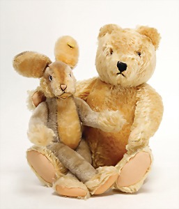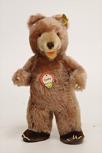 Lulac, Knopf u. Fahne, Nr. 3140/43, Fahne etwas verschlissen, ohne Schild, 1 Orig.-Teddy, 40 cm, ohne Knopf u. Schild, bis auf minim. Stelle an 1 Tatze sehr guter Zust., Stimme defekt