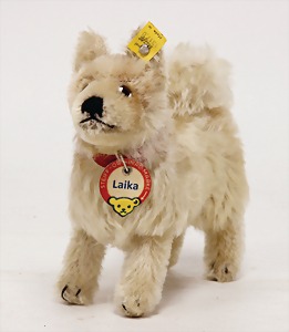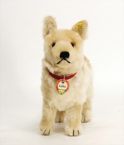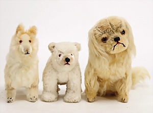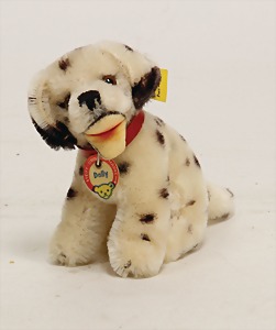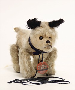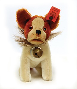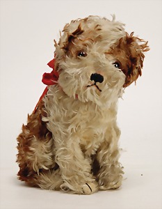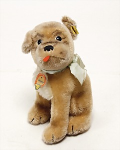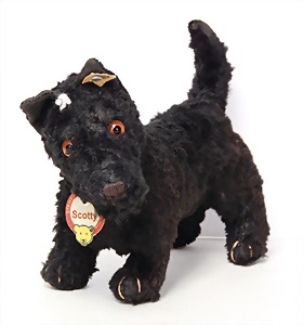 Scotty, Kunstseidenplüsch, kompl., Nr. nicht erkennbar, vorne weggeschnitten, blanker Knopf, Schild mit roter Schrift, Druckstimme defekt, sonst guter Zust., ein wenig Fellverlust am Schwanz, 1949