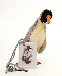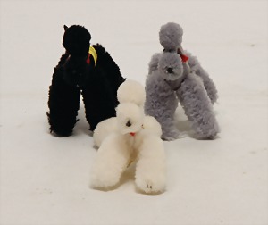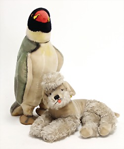 Pudel, liegend, mit Knopf u. Fahne, Nr. 2335.05, ohne Schild, 1 Pinguin, ohne Knopf u. Schild, 46 cm, bespielt, gut
