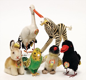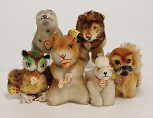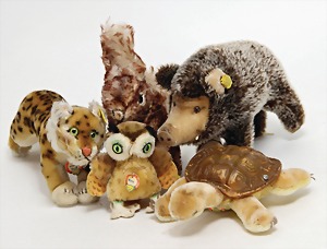 6 Teile, Peggy, komplett, Zebra, komplett, Wellensittich, mit Knopf u. Fahne, Hucki, komplett, Adebar, komplett, Nr. 1017,00, Hase, kompl., Nr. 3309.03, bespielt bis gut, Fahnen teilw. etwas verschlissen