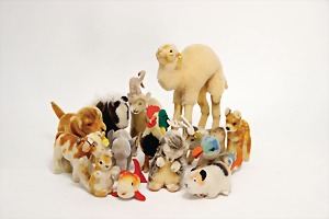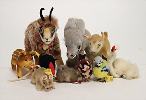 14 Teile, meist ohne Knopf u. Schild, darunter, Renni, kompl., Nr. 1314.00, Ente, komplett, Nr. 2311.07, Hahn Ente, Fisch, kl. Elefant, Dromedar, Steinbock, Kuh, etc., bespielt bis gut