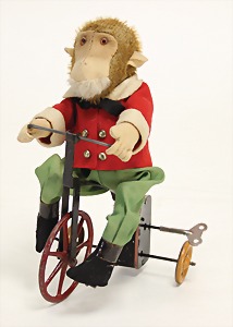 Affe auf Dreirad, ca. 1912, Uhrwerk intakt, Orig.-Filzkleidung, Filzgesicht, -arme u. –beine, teilw. Mohairverlust, mit Orig.-Bing-Plakette, selten, 24 cm, mit orig.- Schlüssel