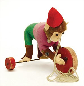 Affe auf Rädern, ca. 1920, Mohair, Filz, Exzenterrad, vorne, 17 cm hoch, Orig.-Bing-Blechschild, teilw. Mohairverlust, kl. Filzschäden, selten