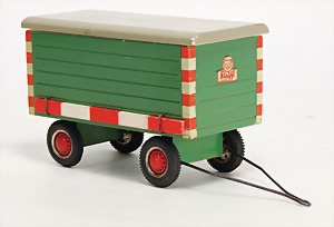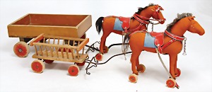 2 Zugpferde, Filz, 27 cm, mit Knopf u. roter Fahne, Nr. nicht mehr erkennbar, kl. Filzfehler, 1 Auge fehlt, 1 Rad lose, passend dazu 1 Wagen, mit Knopf u. roter Fahne, mit Deichsel gerechnet 42 cm, 1 Wagen, ohne Knopf, mit Deichsel gerechnet 58 cm