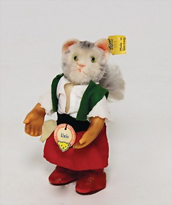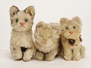 3 Katzen, 11 cm, mit Schild, Schild stark verschlissen, 14 cm, mit Knopf, Fahne stark verschlissen, 1 Katze ohne Knopf u. Schild, Augen bestickt, bespielt, gut