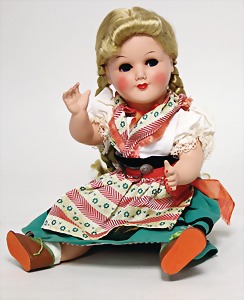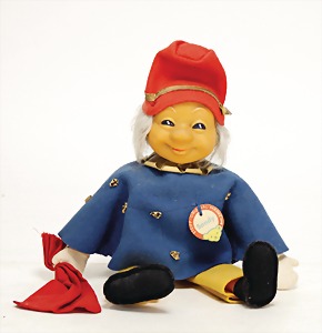 Molly, Vorkrieg, 26 cm, mit Knopf, rote Fahne, Fahne eingerissen, hängt nur noch an einem Zipfel, guter Zust.