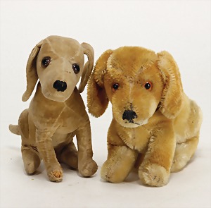2 Teile, Hunde, Treff, Vorkrieg, 14 cm, ohne Knopf, Samt, ein wenig abgeliebt, bespielt, Pfoten off., 1 Hund, 50er Jahre, ohne Knopf u. Schild, bespielt