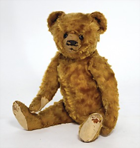 Bär, Vorkrieg, gelb, 42 cm, mit Knopf, lang gezogenes F, Reste gelber Fahne, lange abgeknickte Arme, leichter Buckel, Stimme defekt, Mohairverlust um die Schnauze, Bestickung teilw. abgerieben, Tatzen bis auf minim. Stellen gut