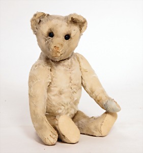 Bär, Kriegsproduktion, Wollplüsch, 45 cm, lange abgeknickt Arme, leichter Buckel, mit Knopf und Fahne, Nr. unleserlich, Filztatzen bis auf kl. Stellen gut, Stimme intakt, Wollplüsch etwas verschmutzt, Dachbodenfund