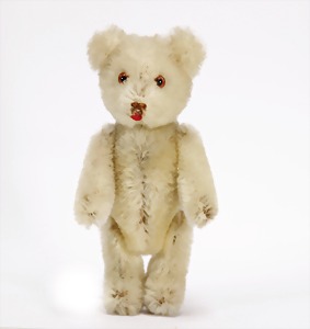 Bär, 34 cm, früh, Schuhknopfaugen, lange abgeknickt Arme, Buckel, helle Bestickung, weißes Mohair, stark abgeliebt, etwas vergilbt, ohne Knopf, Tatzen übernäht