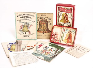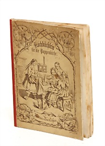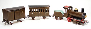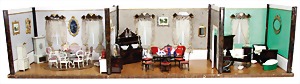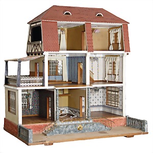 3-tlg. Puppenstube, ca. 1870, 1,45 m breit, 36 cm hoch, 38 cm tief, zusammensteckbar, (Reisestube), 5 Fenster, 2 Durchgangstüren, Orig.-Tapete an Wand u. Boden, Orig.-Außenbemalung, Orig.-Vorhangblenden mit Vorhängen, möbliert mit prächtigen Rock & Graner Möbeln, weißer Salon, gepolsterte Möbel, Sofa, Länge 16,5 cm, Spiegel, Höhe 22 cm, Schrank, Kommode, Ofen, Sitzgruppe dunkel, gr. Schrank, Kommode, Schlafzimmer, Kleiderschrank, Bett, Nachttisch, Wachtisch, Kinderwiege, 2 kl. Biedermeier Puppen, 1 Puppe Fuß bestoßen, Bilder, Zinnteile, Zubehör, Stube wurde direkt von der Familie eingeliefert, mit alter Spanschachtel f. das Mobiliar, Maria Bauer Mühlacker