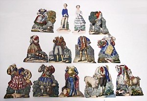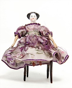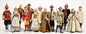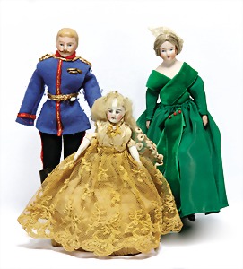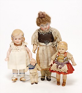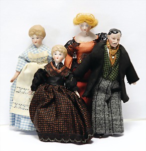 4 Teile, Puppenstuben-Puppen, 3 Damen, 14 – 14,5 cm, 1 Mann mit Schnurrbart, 15,5 cm, teilw. Füße weggebrochen, 1 Figur Arme u. Beine ergänzt, Kleidung aus alten Stoffen genäht