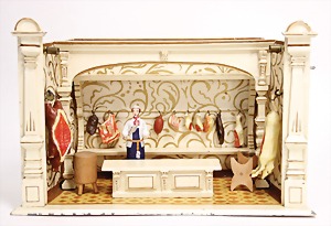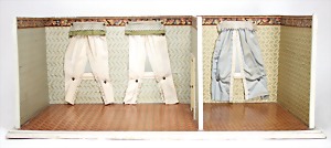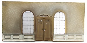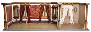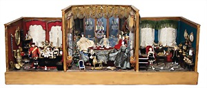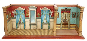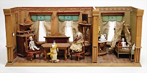 2-tlg. Puppenstube, um 1900, 60 cm breit, 25 cm hoch, schöne Gr., Orig.-Tapete an Wand u. Boden, 3 Fenster, Durchgangstür, möbliert, mit Puppen, schöner Orig.-Zust.