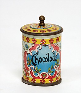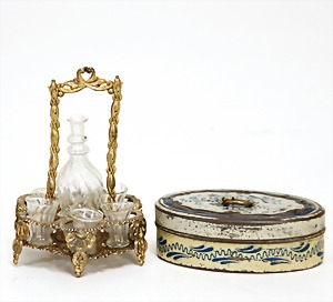2 Teile Puppenstuben-Zubehör, Flaschenhalter, Zinn, mit Karaffe u. 6 Gläsern, dazu 1 Brotdose, Blech lithogr.