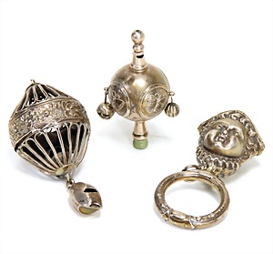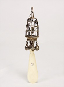 Kinderrassel, Bein, silber, Vogelkäfig, mit Flöte u. Glocken