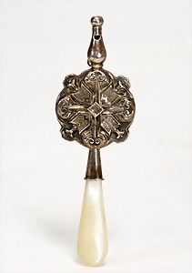 Kinderrassel, silber, Hund mit Rasseln, Griff perlmut, 12 cm