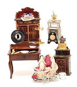 Puppenküchen-Herd, ca. 1895, 33 cm breit, eingebautes Wasserschiff, vorne mit Hahn, Wasserkessel, Topfpfanne, Topf, 1 Topf ohne Deckel, vordere Messingleiste etwas lose, Orig.-Zust., außergew. Form
