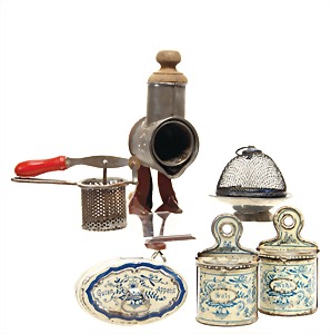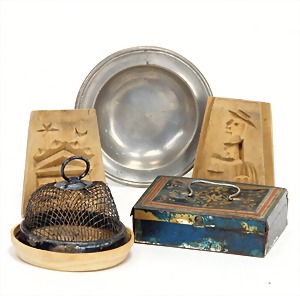 Konv. Puppenküchen-Zubehör, Bettflasche, Zinn, mit Einsatz f. Babyflasche, einige Kupferteile, Waage, Blech-, Holz- u. Gussteile, ein paar Kupferteile neuer