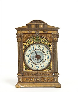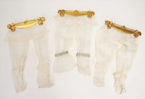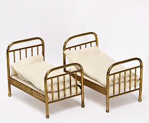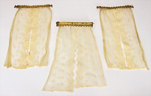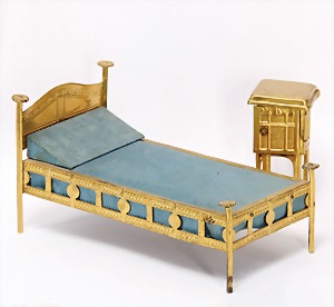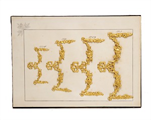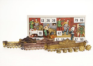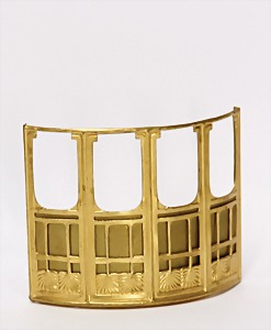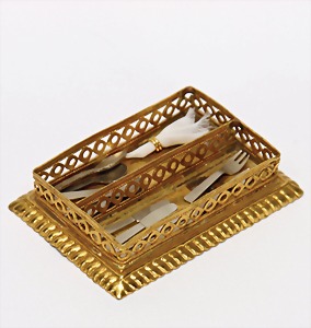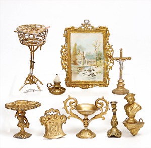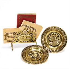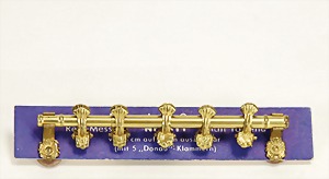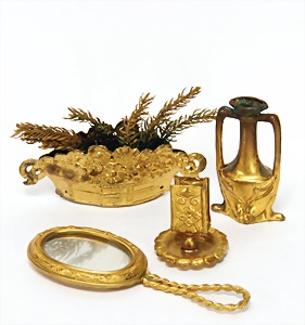 Musterkarte, Messing/Blech vergoldet, Puppenheim-Garnitur No. 413, Rein Messing, 4-tlg., mit Klammern