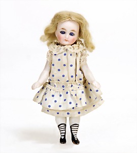 4 Puppenstuben-Puppen, 13 cm, Biskuit-Kurbelkopf, Masse-Stehkörper, Orig.-Kleidung, kl. Ganzbiskuit-Puppe, 10 cm, 2 kl. Celluloid-Puppen, Minerva