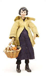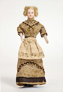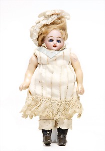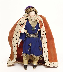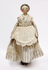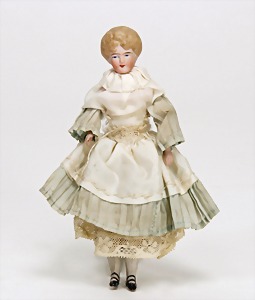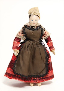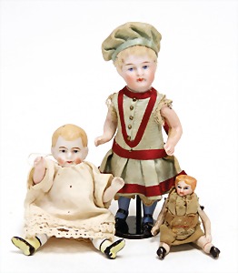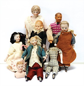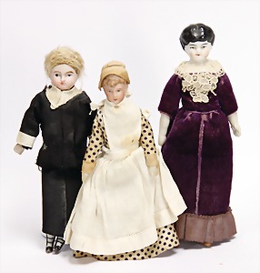3 Teile, Puppenstuben-Puppen, Haushälterin, 11,5 cm, Biskuitkopf, -arme u. –beine, Stoffkörper, alte Kleidung, 14 cm, glasierter Kopf, Biskuit-arme u. –beine, Stoffkörper, Kleidung aus alten Stoffen genäht, 13 cm, Biskuit-Brustblattkopf, Perücke, Arme u. Beine, Stoffkörper