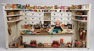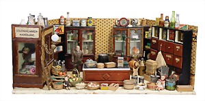 Modeladen, 1,13 m x 56,5 cm, Fächer, Schubladen, vorne Schaufenster, seitl. Türen, teilw. farbl. ausgebessert, reichh. Zubehör, teils älter, teils jünger, dekorativ