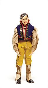 2 kl. Ganzbiskuit-Puppenstuben-Puppen, 9 cm, feste Köpfe, fest eingesetzte Glasaugen, geschl. Mund, bewegl. Arme u. Beine, im Orig.-Kart., beschriftet: Fränkische Tracht, um 1900