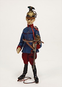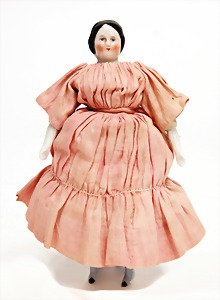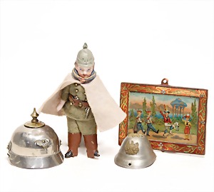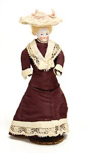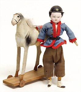 Puppenstuben-Puppe, Soldat, 19 cm, Biskuit-Brustblattkopf, anmodellierter Schnurrbart, Biskuitarme, Beine fehlen, durch Stiefel ergänzt, Dame, 18 cm, Biskuit-Brustblattkopf, -arme u. –beine, Kleid ergänzt, 1 Biskuit-Brustblattkopf-Puppe, Biskuitarme u. –beine, Stoffkörper