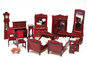 Puppenstuben-Möbel, Wohnzimmer, wohl 30er Jahre, Kommode, 20,5 cm, Sitzgruppe mit Serviertisch, im Orig.-Kart., Kart. altersbed. stark verschlissen, dazu 1 Schlafzimmerprogramm, Höhe Schrank 14,5 cm