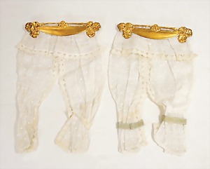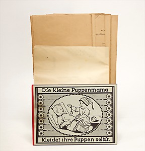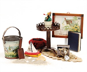Puppenstuben-Ausschmückungsteile f. Modeladen, 2 Bürsten mit Spiegel, Halter Zinn, einige Teile Puppenkleidung f. kl. Puppen, 1 Schachtel Briefumschläge