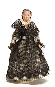 7 Teile, Puppenstuben-Puppen, Haushälterin, 15 cm, Mann mit Schnurrbart, 14 cm, Mann mit Schnurrbart, stirnrunzelnd, 12,5 cm, meist guter Zust., 1 Mann Kopf lose, ohne Kleidung