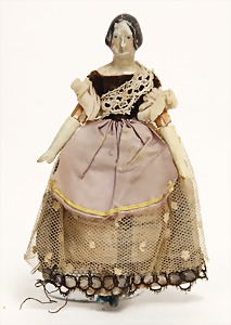 Biedermeier-Puppenstuben-Puppe, Mann mit aufgemaltem Schnurrbart, 18,5 cm, alte Kleidung