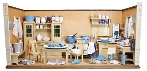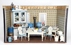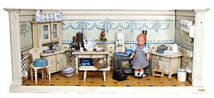 Puppenstuben-Küche, ca. 1910, 1,04 m breit, 46 cm hoch, möbliert, reichh. Zubehör, Tapete Delftner Kachelmuster