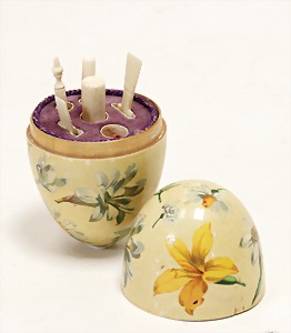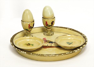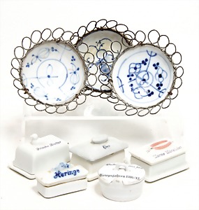Puppenstuben-Ausschmückungsteile, 2 x sakraler Brunnen, Porzellan, 5 cm, Rauchertisch, 4 Kelche, 1 Tischlampe, kl. Tischuhr, Ziffernblatt fehlt
