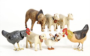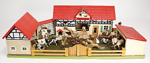 Stall, 57 cm breit, 40 cm hoch, mit Masse-Pferden, 2 Figuren, Federvieh