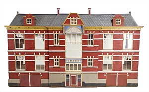 Puppenstubenschule, 54,5 cm breit, 30 c hoch, 35 cm tief, möbliert, sehr schöne Bemalung innen u. außen, 4 Fenster